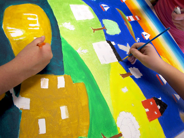The first thing to be painted was the sun! They each had an element to paint and took turns to do it. The ocean was done by several students:) I helped them with the sky, showed how to blend the colours and use long strokes.